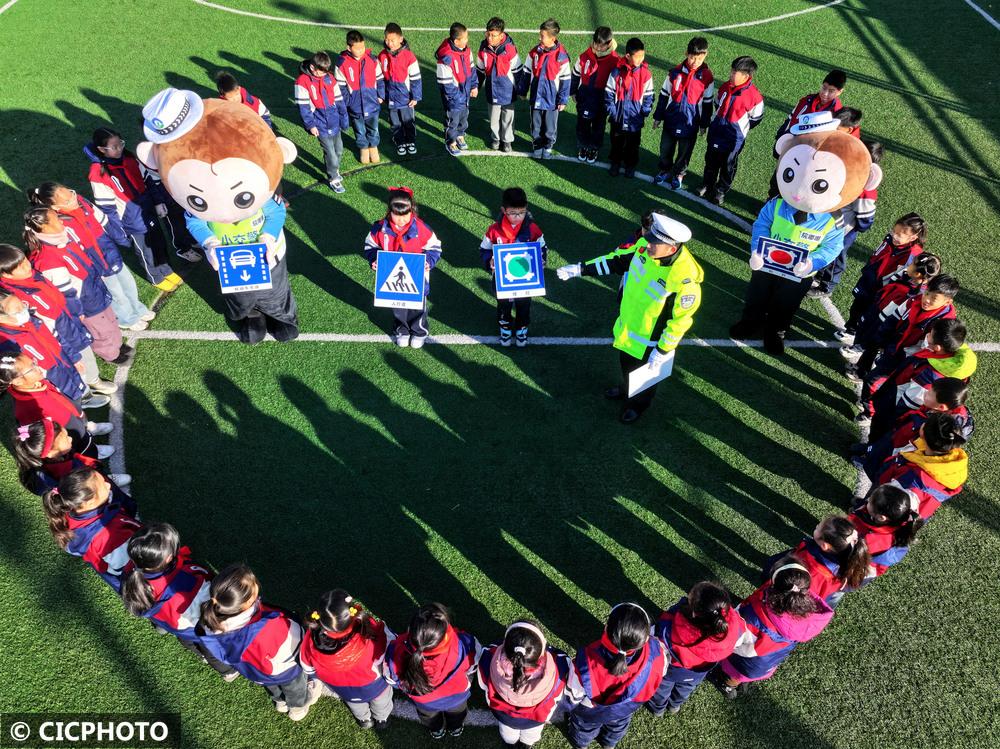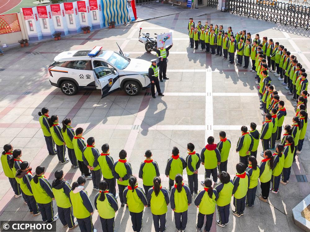 ↑2025年2月13日,在江苏省连云港市院前小学,连云港市交警支队民警在为学生讲解交通安全知识。(无人机照片)CICPHOTO/王春 摄