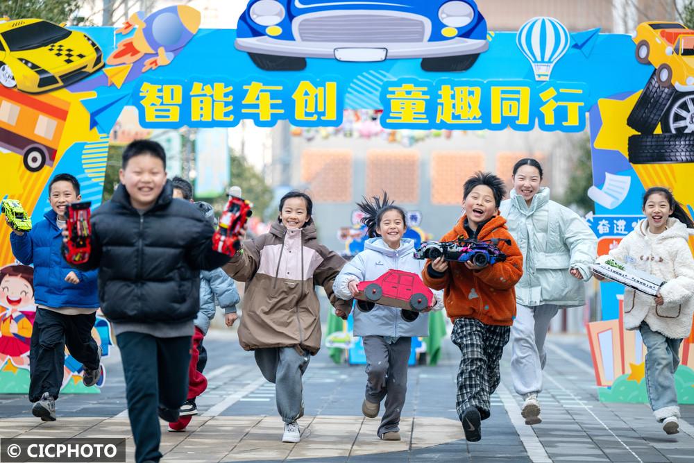 ↑2025年2月13日,在浙江省湖州市长兴县实验小学(龙山校区),学生在展示自己寒假期间制作的动力汽车。CICPHOTO/谭云俸 摄