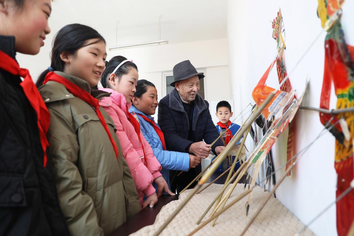 ↑2025年2月13日,在河北省唐山市丰润区火石营镇黄昏峪小学,皮影艺人在指导学生表演皮影戏。CICPHOTO/朱大勇 摄 编辑:武兴