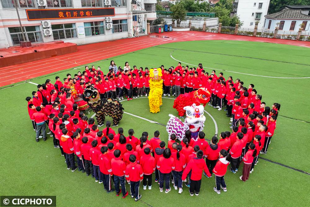 ↑2025年2月13日,在福建省福州市仓山区麦顶小学,学生在观看舞狮表演。(无人机照片)CICPHOTO/谢贵明 摄