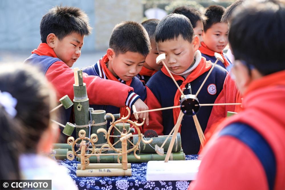 ↑2025年2月13日,在浙江省湖州市长兴县吕山乡中心小学,学生在欣赏寒假科创作业。CICPHOTO/周洪峰 摄