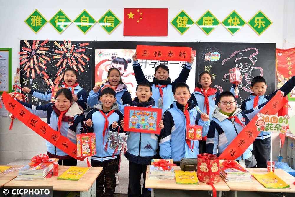 ↑2025年2月13日,在湖北省襄阳市保康县实验小学,学生在展示自己制作的寒假手工作品。CICPHOTO/杨韬 摄