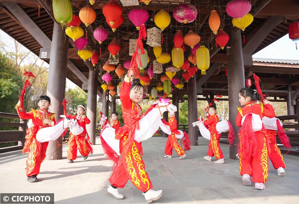 ↑2025年2月13日,在浙江省湖州市长兴县开发区中心幼儿园,孩子们在练习下箬马灯。CICPHOTO/陈海伟 摄