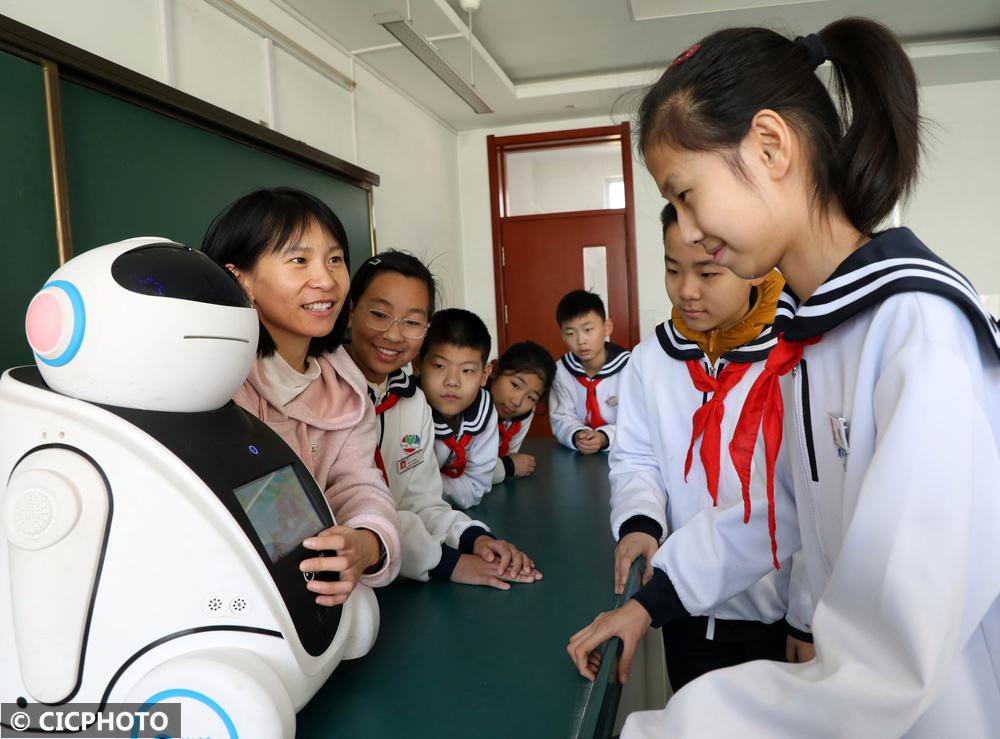 ↑2025年2月13日,在山东省滨州市博兴县第一小学,老师在“机器人第一课”上指导学生和智能机器人互动。CICPHOTO/陈彬 摄