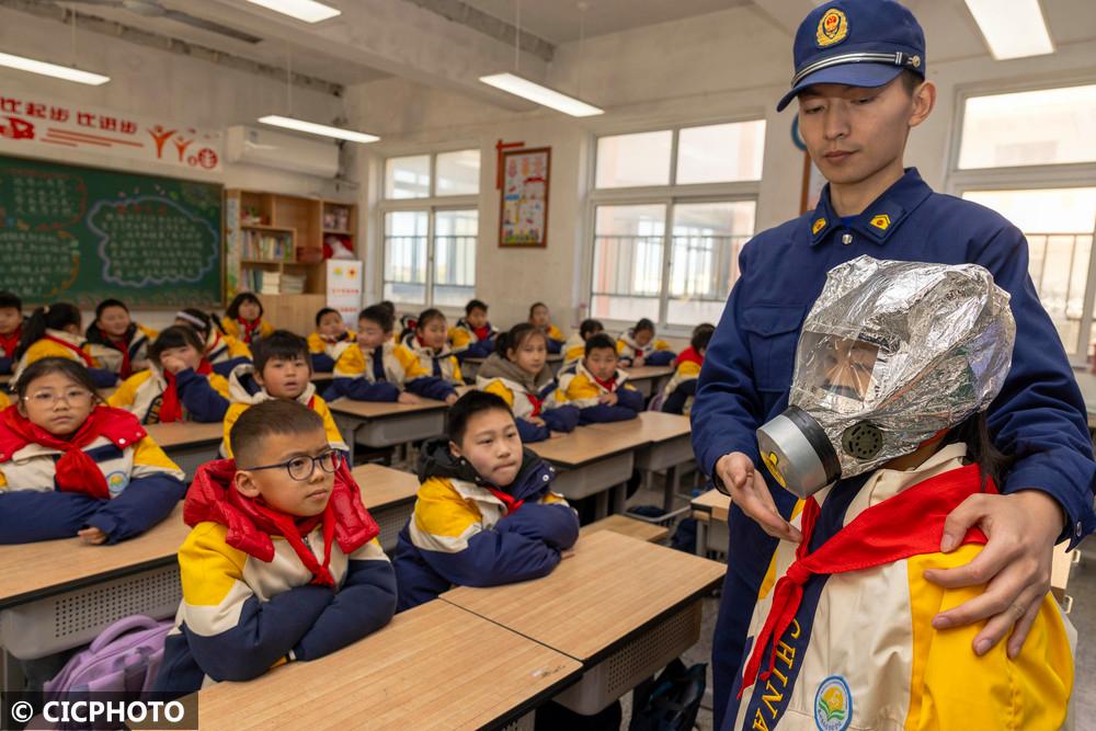 ↑2025年2月13日,在江苏省泰州市海陵区九龙实验学校,消防救援队员在给学生介绍过滤式消防自救呼吸器。CICPHOTO/汤德宏 摄