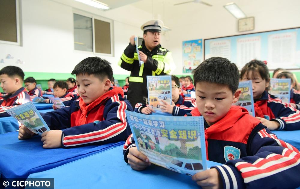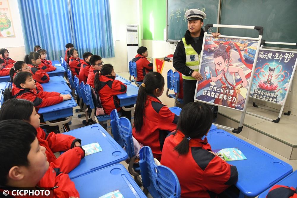 ↑2025年2月14日,在河北省石家庄市栾城区凌空桥路小学,交警在给学生们讲解交通安全知识。CICPHOTO/李明发 摄