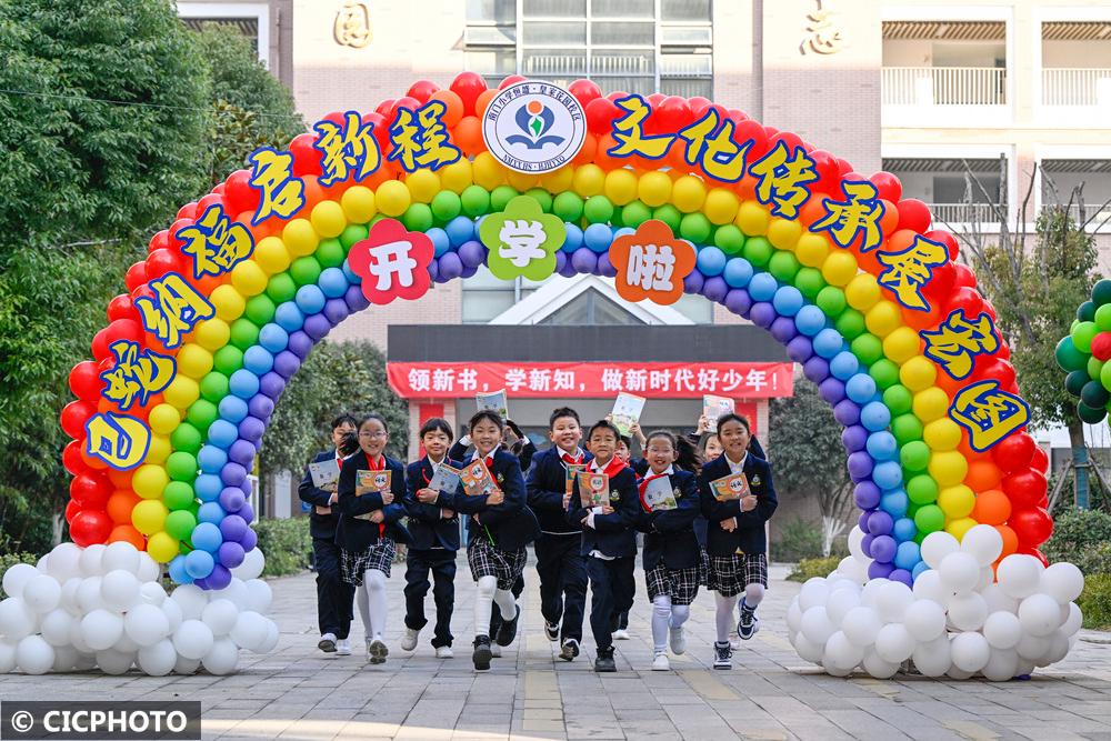 ↑2025年2月13日,在安徽省合肥市庐阳区林店街道南门小学恒盛皇家花园校区,学生步入校园。CICPHOTO/赵明 摄