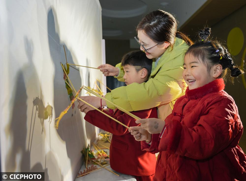 ↑2025年2月14日,在浙江省湖州市长兴县水木花都幼儿园,孩子们在体验非遗皮影戏。CICPHOTO/谭云俸 摄
