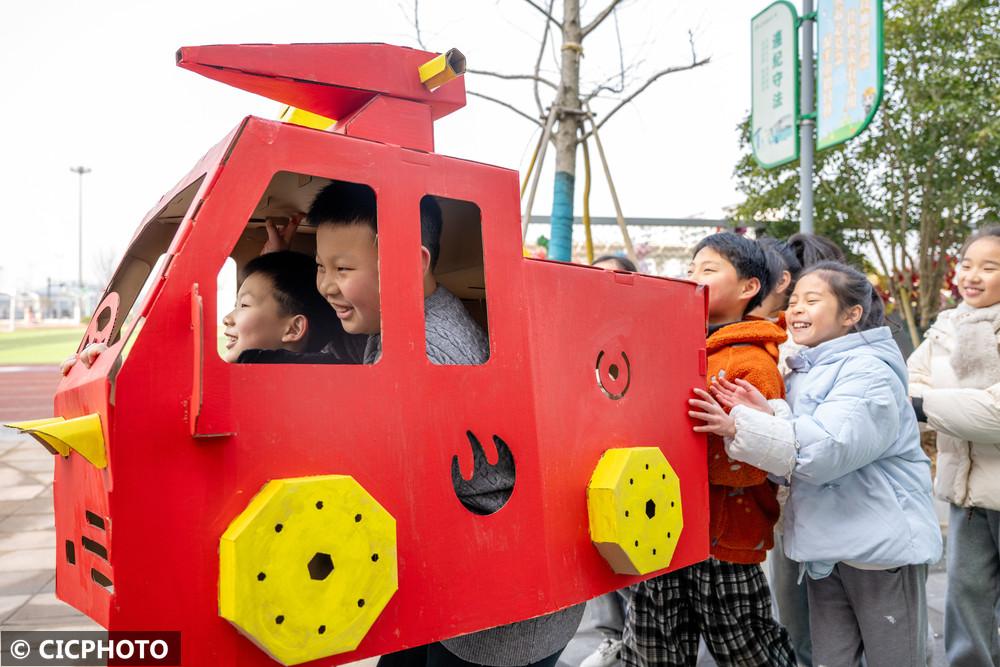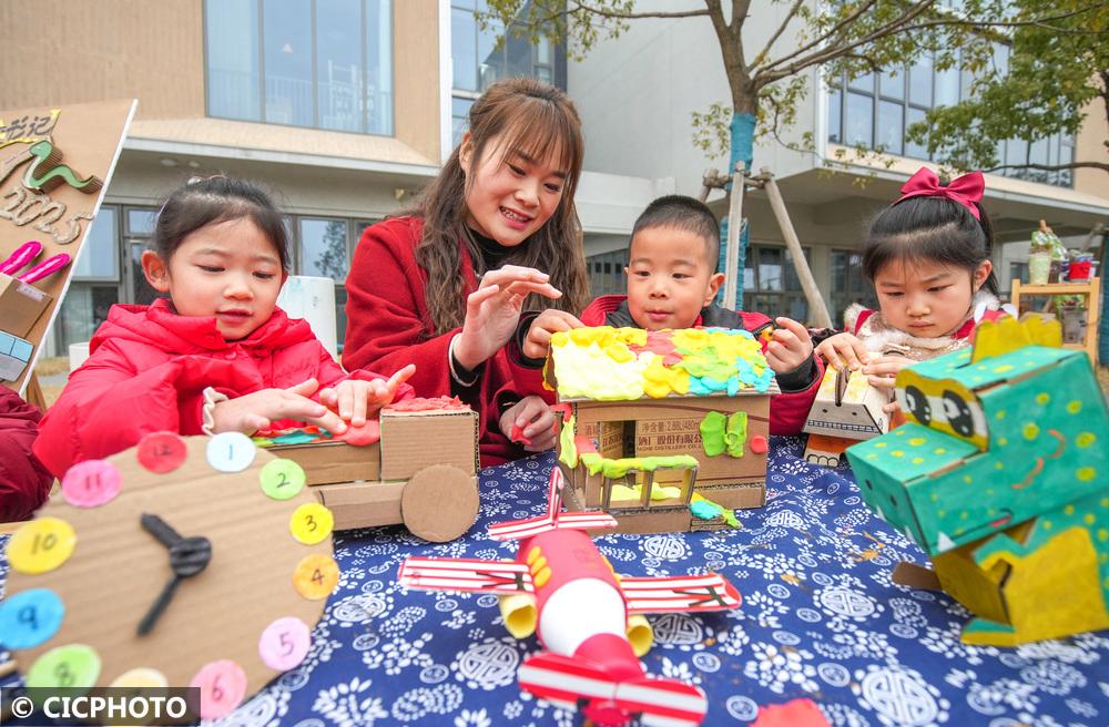 ↑2025年2月14日,在浙江省湖州市德清县远望幼儿园,小朋友在利用废纸盒制作手工艺品。CICPHOTO/王树成 摄