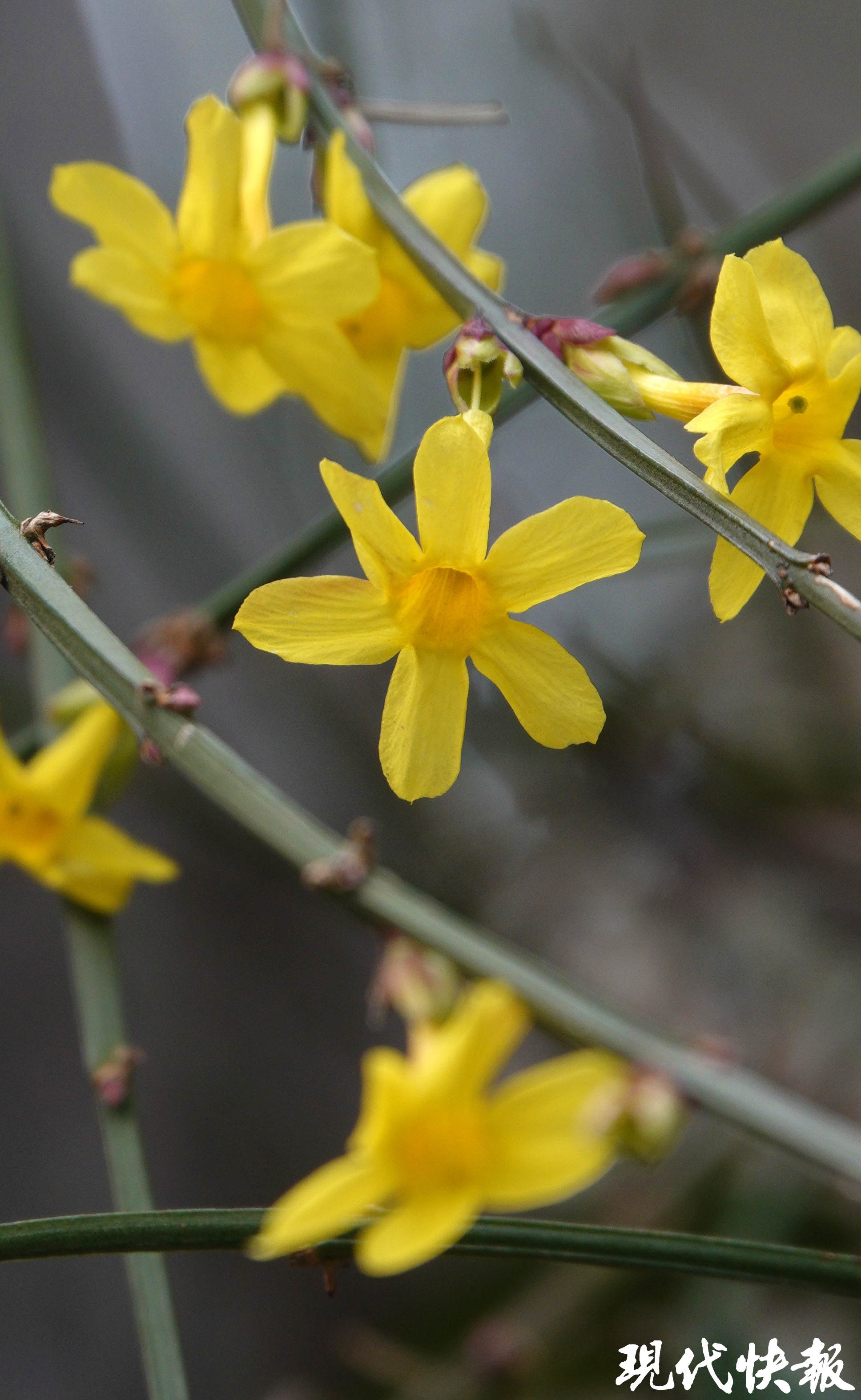 迎春花绽放黄色的小花,在枝条上飘逸着神韵。