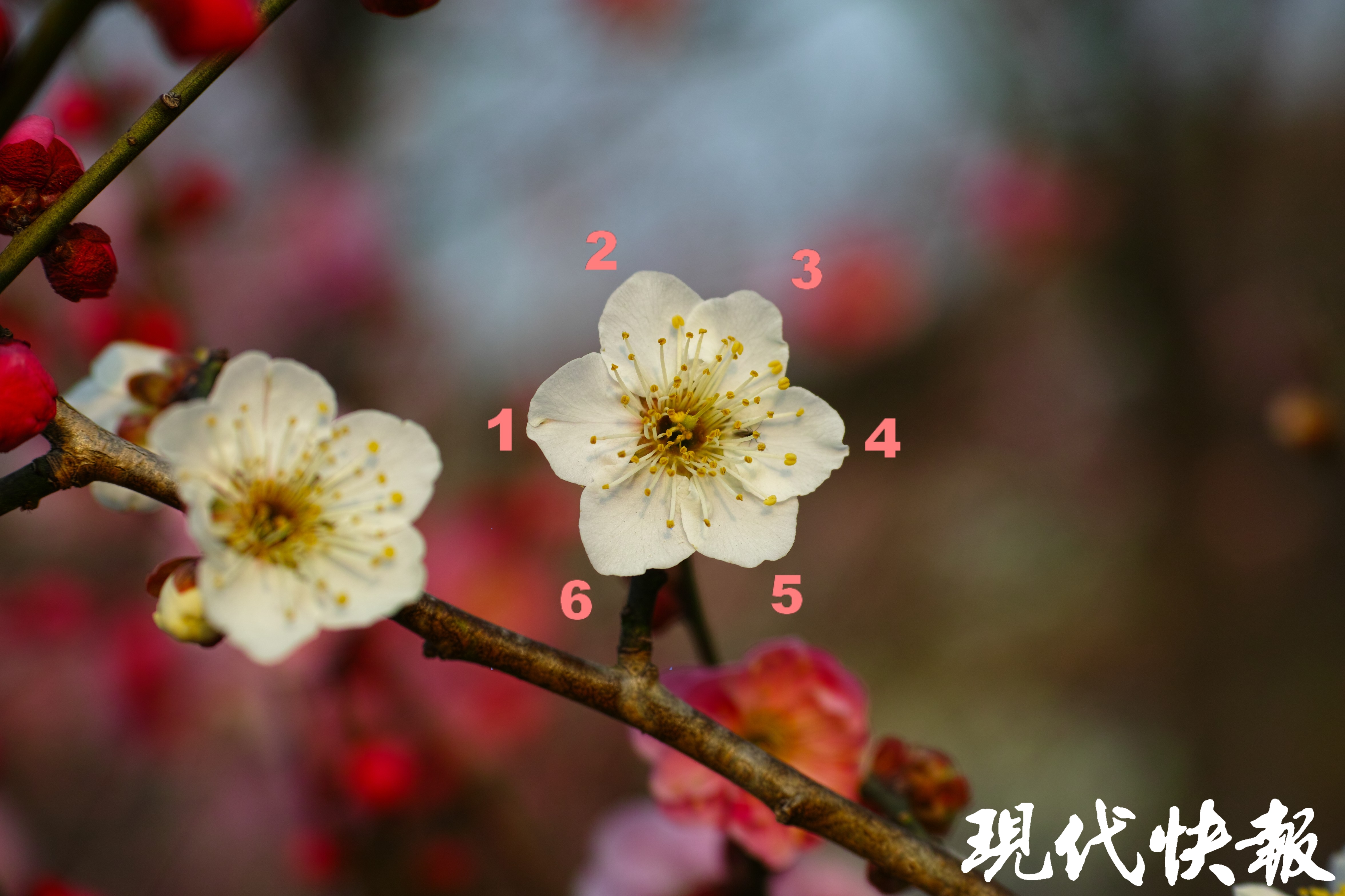 今年冬天的冷热交替让梅花早早的迎来了初绽,湖上梅林里除了“性急”的淡粉色的江梅,还有宫粉梅、白梅、绿萼、玉蝶等都迫不及待的探出枝头。现代快报记者看到,多株江梅开出了六瓣花朵,在早春暖阳的映照下,花瓣晶莹剔透,散发着独有的清新雅致。据景区工作人员介绍,江梅通常花瓣为五瓣,此次罕见地开出六瓣花朵,应该是遗传变异、温度、光照、土壤养分等因素变化导致的结果。