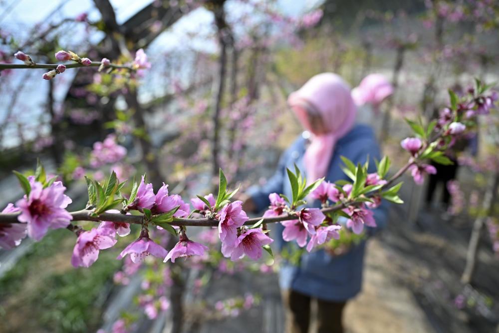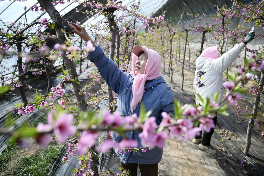 近日,宁夏银川市贺兰县金贵镇日光温室内桃花盛开、春意盎然,农户忙着为桃树剪枝。据了解,金贵镇近年来依托日光温室果蔬种植,结合乡村旅游、休闲采摘等体验项目,吸引众多游客前来赏花、观光、采摘。“产业+乡村游”已成为当地百姓致富的新模式。