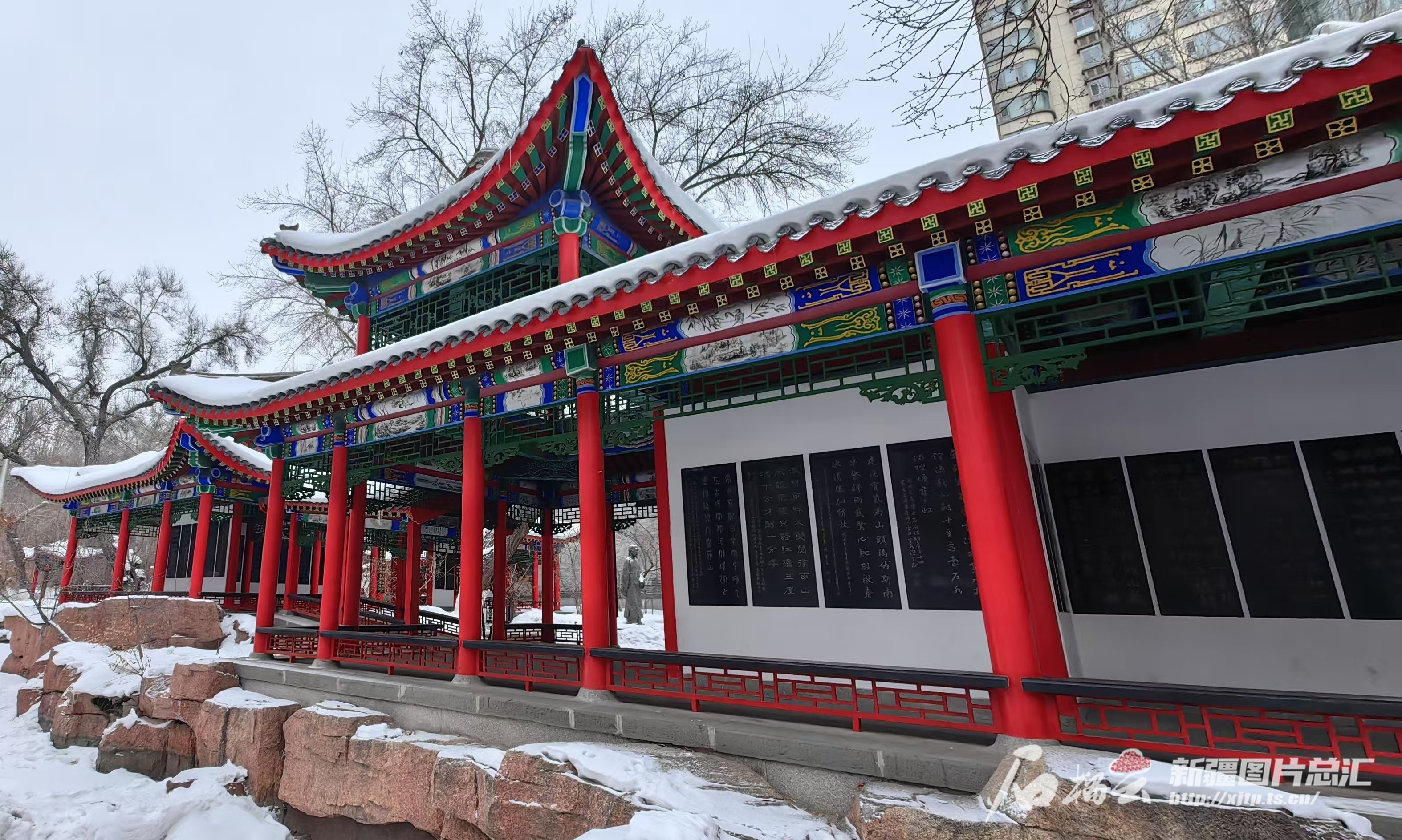 2月22日,一场小雪后的乌鲁木齐银装素裹,乌鲁木齐市人民公园内的岚园更显古朴雅致,充满诗意。