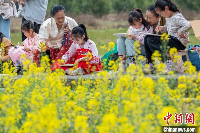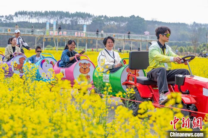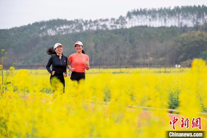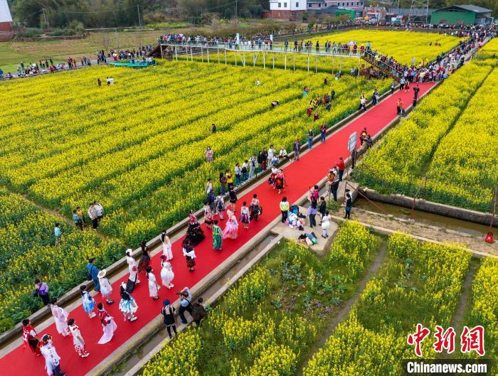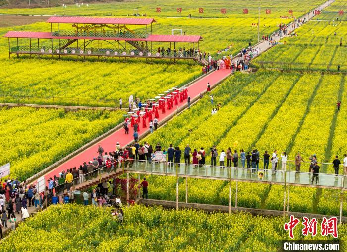 3月1日,广西梧州市龙圩区龙圩镇念村稻渔综合种养示范基地万亩油菜花竞相盛开,吸引游客前来赏花游玩,共享春天的美景。图为游客在油菜花田里赏花游玩。何华文摄