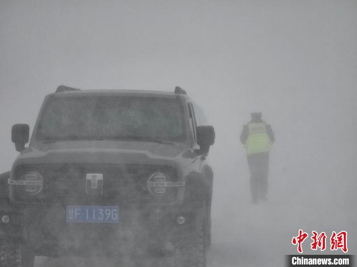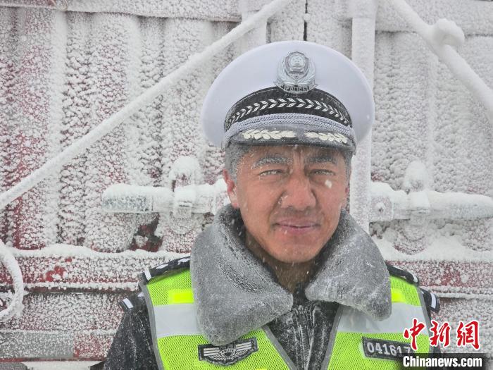 图为交警在雪中执勤。茫崖市公安局供图
