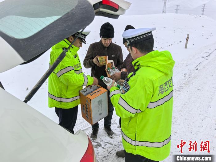 图为交警为滞留旅客发放应急物资。茫崖市公安局供图