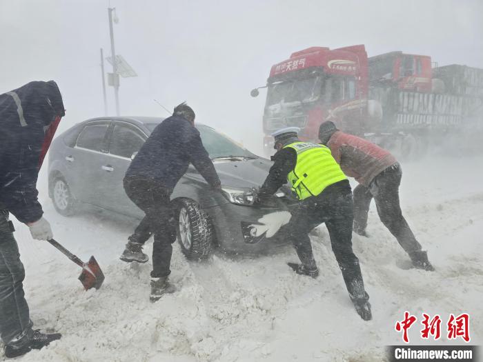 图为交警与民众合力推车。茫崖市公安局供图