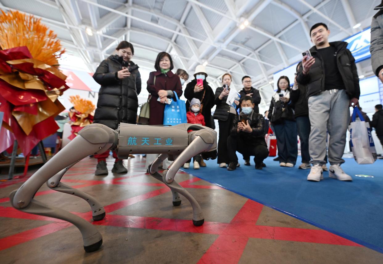 ↑3月6日,观众在天津工博会上参观一款四足机器人。