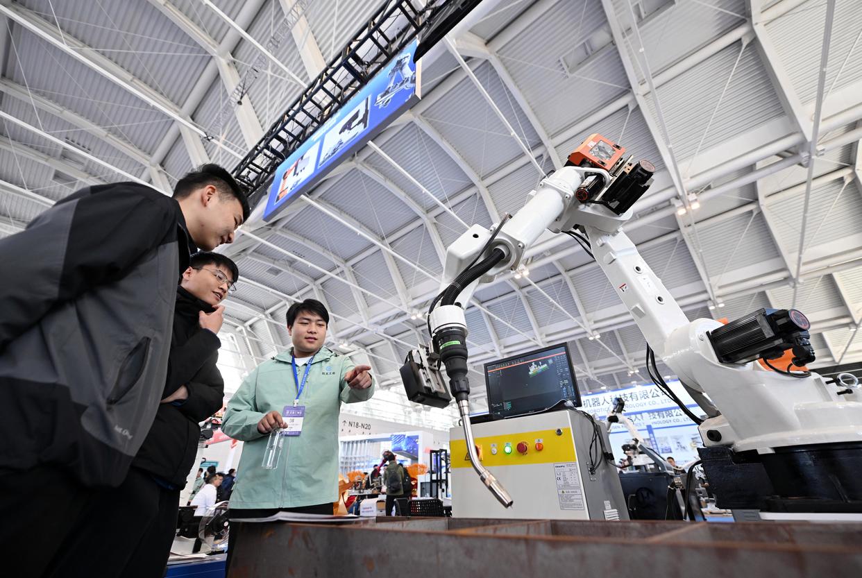 ↑3月6日,在国家会展中心(天津),宇树科技带来的一款人形机器人现场表演。当日,第21届中国(天津)国际装备制造业博览会在国家会展中心(天津)开幕。本届天津工博会以“智能驱动,创新引领”为主题,近1000家展商参展,带来了新一代工业机器人、精密减速器、传感器等超4000款产品,吸引了众多企业客户和观众前来感受工业科技发展魅力。