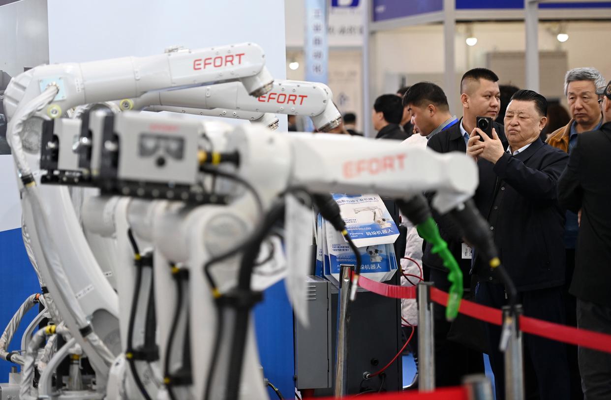 ↑3月6日,观众在天津工博会上参观一款工业机器人。