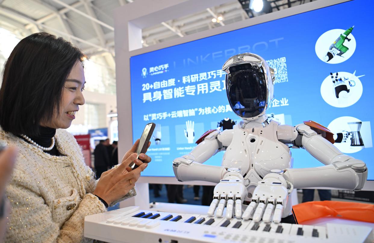 ↑3月6日,在国家会展中心(天津),观众观看一款安装有灵巧手的机器人弹钢琴。