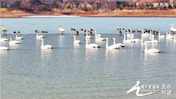 近日,随着天气逐渐回暖,山西省晋中市昔阳县郭庄水库迎来了今年迁徙归来的天鹅前来歇脚,它们的抵达时间比以往提早了半个月。