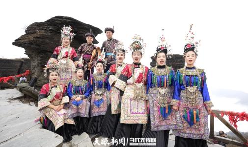 在梵净山“非遗民族秀”活动期间,游客还现场近距离观赏了一场苗族服饰与文化的非遗盛装秀。生活在这里的苗族群众,服饰以交领右衽、蜡染百褶裙、繁复的银角头冠等为特色,其服饰上的纹样体系堪称“穿在身上的密码”。
