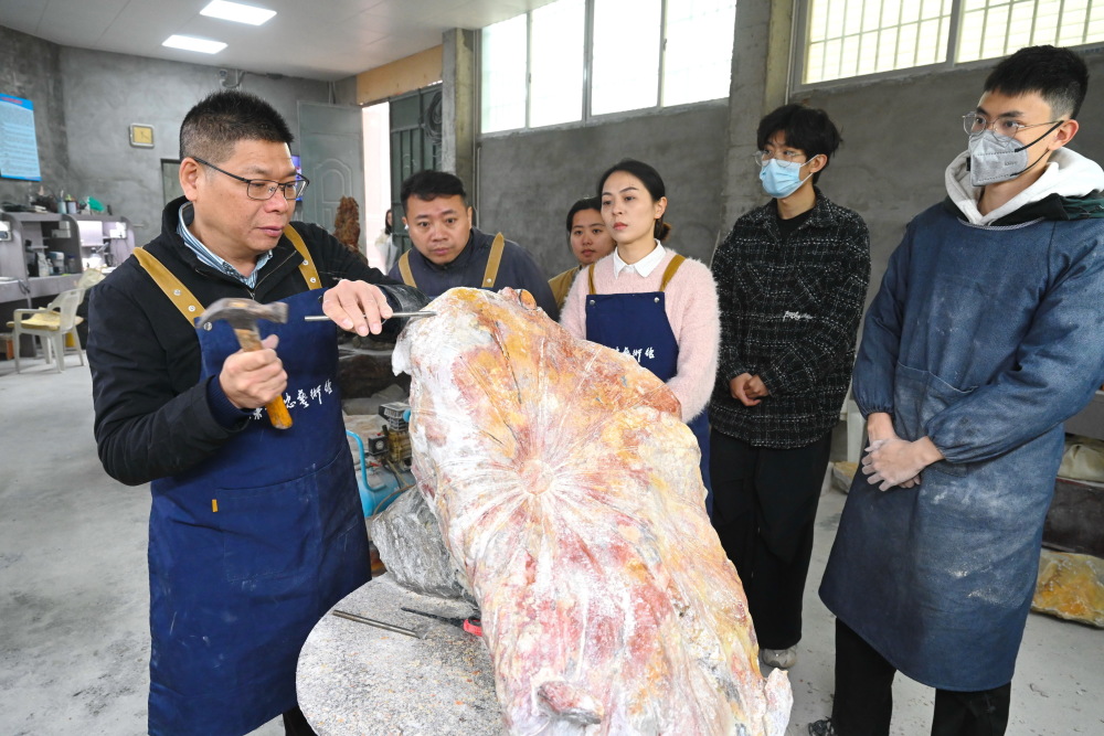 3月5日,中国工艺美术大师陈礼忠(左一)在给学生示范寿山石雕刻技法。新华社记者 林善传 摄