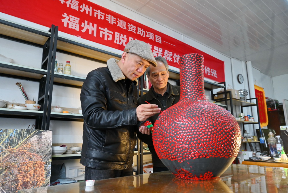 3月6日,福建省工艺美术大师陈天灨(右)在指导学生进行漆器髹饰技法。新华社记者 林善传 摄