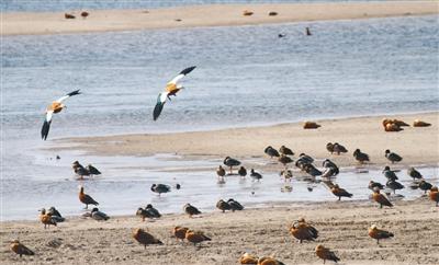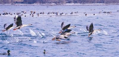浑河东段橡胶坝上,大雁伸展长颈、扇动羽翼,将身影印上蓝天;成群的野鸭如泼墨般点缀于波光粼粼的水面。