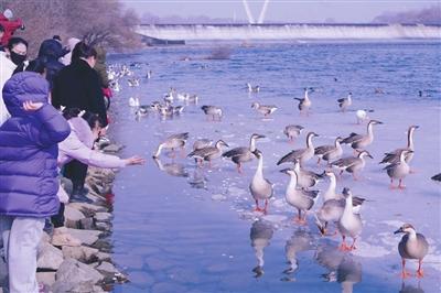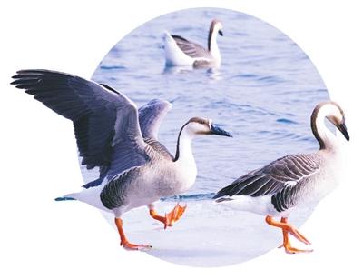 长青桥下大雁踱步、休憩、舒展羽翼,尽显野趣。