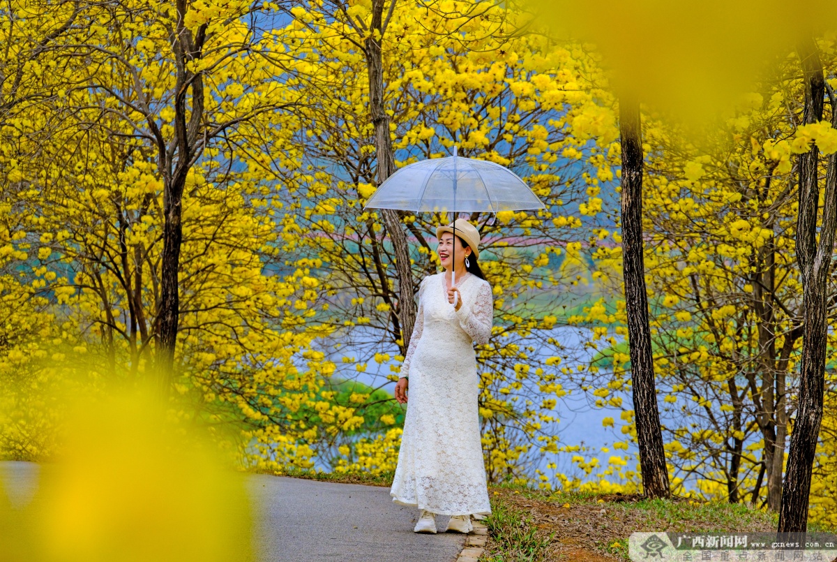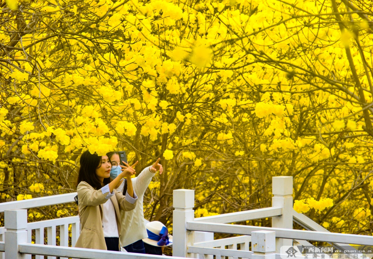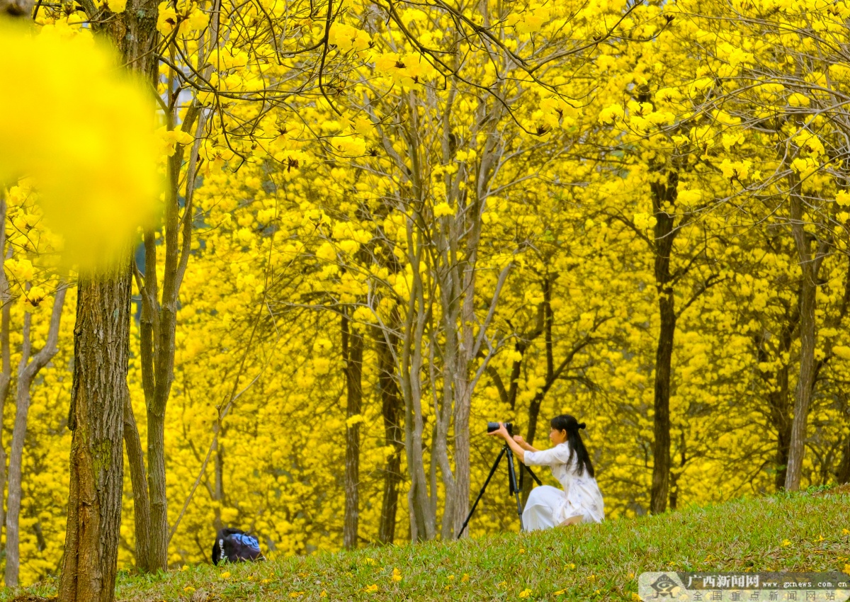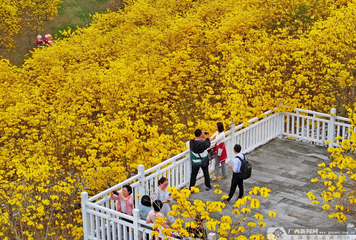 时下,正是南宁市青秀山风景区内的黄花风铃木盛放时节,3月15日恰逢周末,吸引众多游客前往观赏。