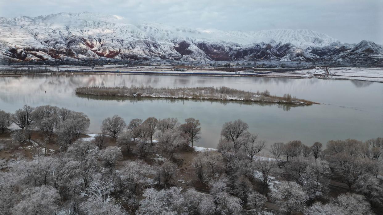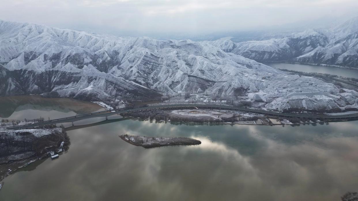 这是3月14日在甘肃省临夏回族自治州永靖县太极镇拍摄的雪景(无人机照片)。新华社发(史有东 摄)