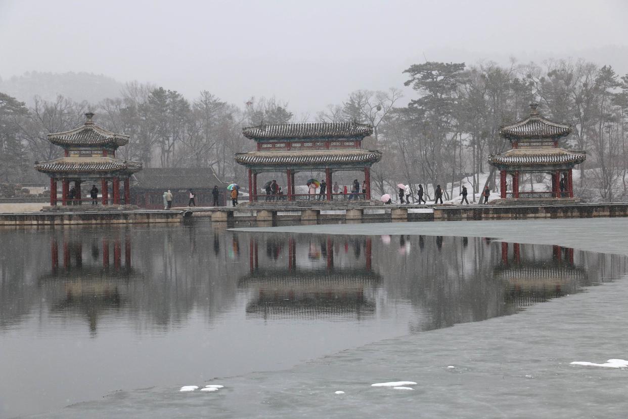 3月15日,游客在承德避暑山庄赏雪游玩。新华社发(刘环宇 摄)