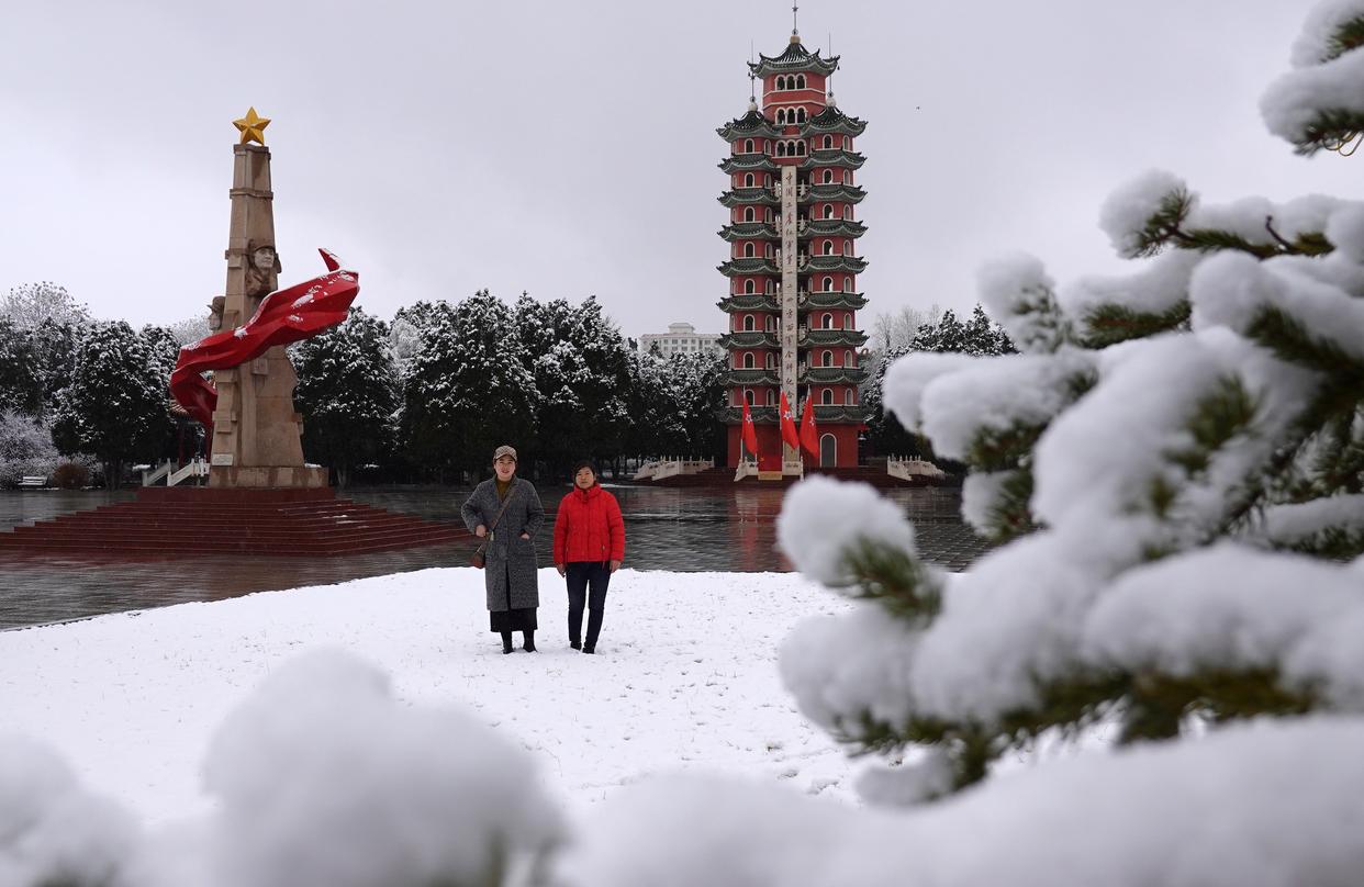 3月14日,游客冒雪参观甘肃省白银市会宁县红军会宁会师旧址景区。新华社发(常琦彪 摄)