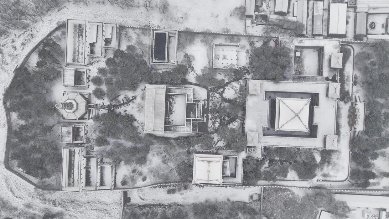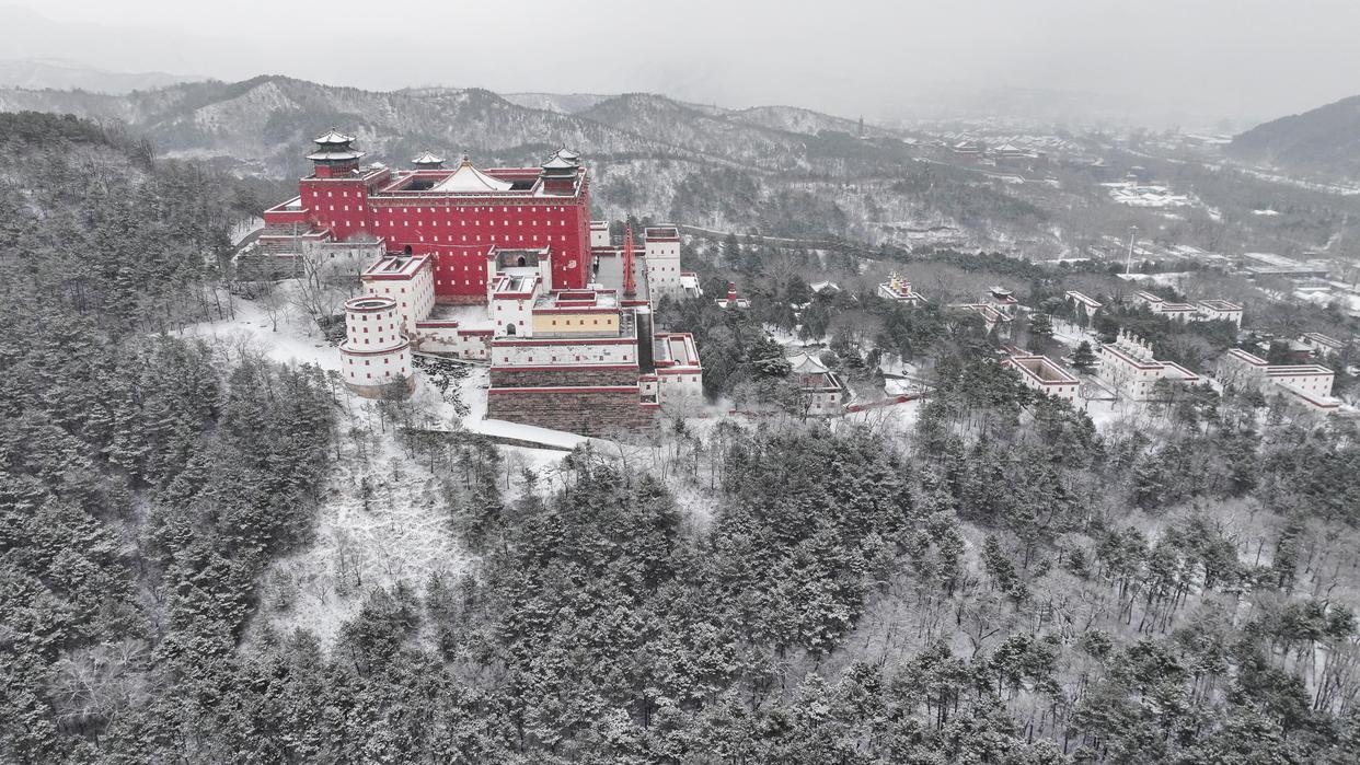 这是3月15日在河北承德须弥福寿之庙拍摄的雪景(无人机照片)。新华社发(刘满仓 摄)