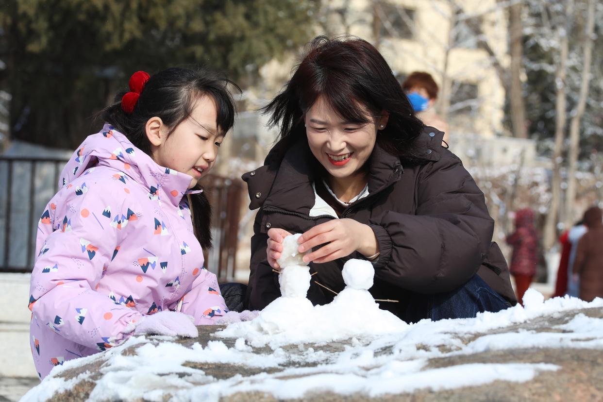 3月15日,母女俩在河北省张家口市人民公园堆雪人。新华社发(武殿森 摄)