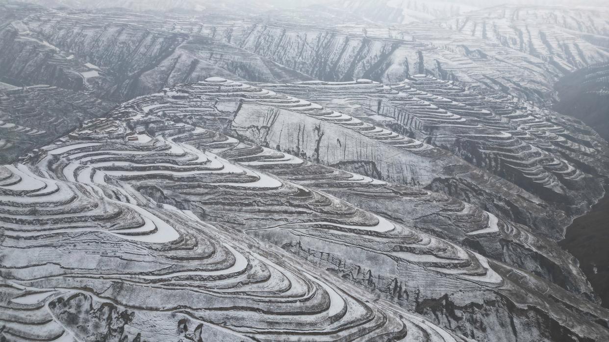 这是3月14日在甘肃省临夏回族自治州东乡族自治县董岭乡拍摄的梯田雪景(无人机照片)。新华社发(史有东 摄)