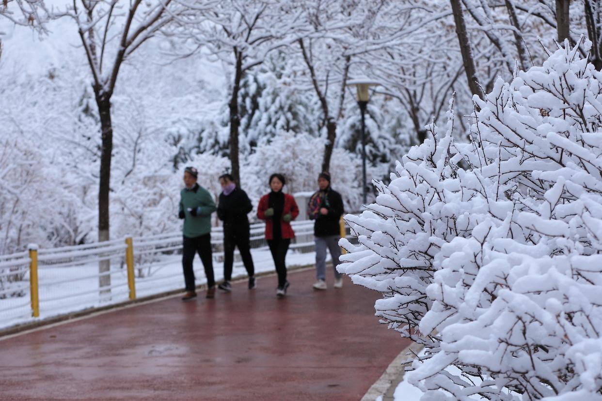 3月14日,市民在雪后的甘肃省定西市安定区生态园跑步晨练。新华社发(陈永刚 摄)