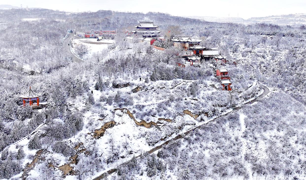 这是3月14日在甘肃省平凉市静宁县文屏山拍摄的雪景(无人机照片)。新华社发(王毅 摄)