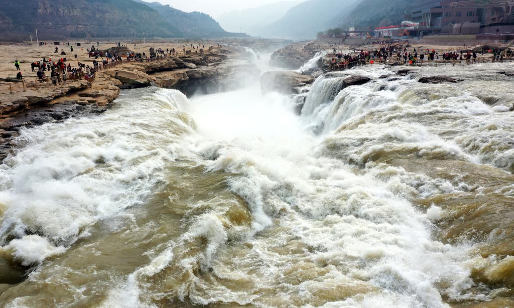 据当地水文部门介绍,目前黄河吉县段已完全开河,流凌已全部消融,黄河壶口瀑布最大水流量约为900立方米/秒,主副瀑布连成一片,出现壮美瀑布群景观。(记者王飞航)