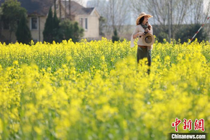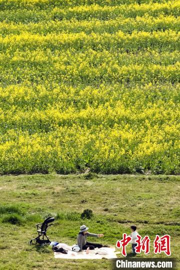 3月19日,位于长江中的南京江心洲一处油菜花地花开正盛,与隔江的城市楼宇相呼应,呈现如画般的景致。图为市民在这里拍照留影。 中新社记者泱波摄