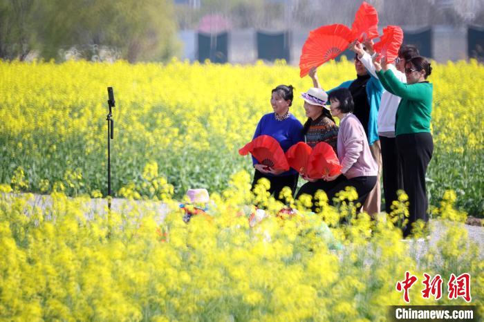 3月19日,位于长江中的南京江心洲一处油菜花地花开正盛,与隔江的城市楼宇相呼应,呈现如画般的景致。图为年轻人在这里拍照留影。 中新社记者泱波摄