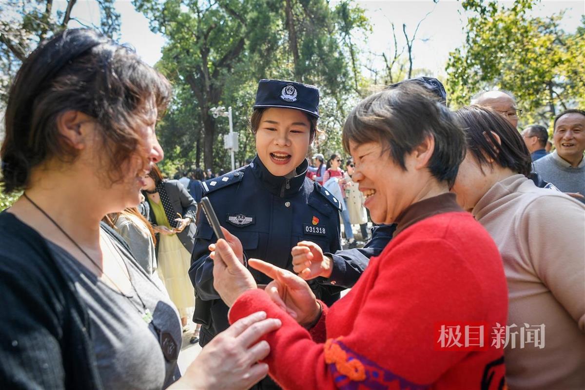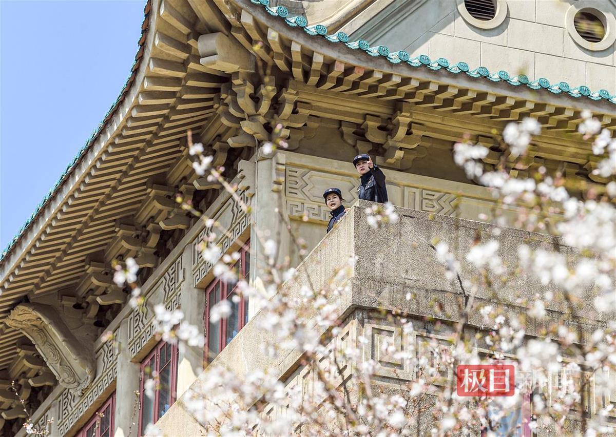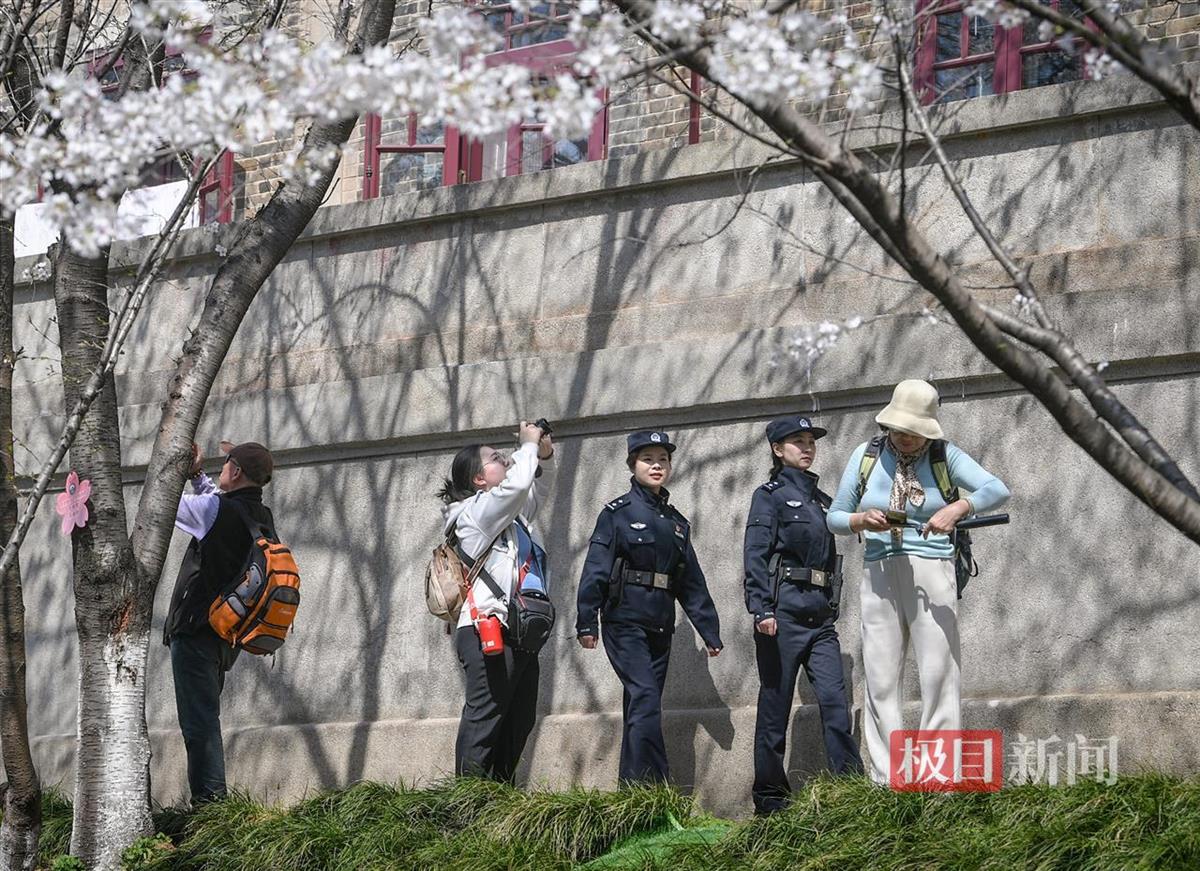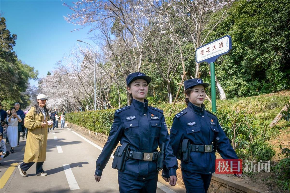 3月21日,武汉大学樱花迎来盛放期,校园内游人如织。为保障赏樱秩序与师生安全,武昌区公安分局民警胡晓梦、杨喆坚守岗位,在樱花大道、万林广场等核心区域开展巡逻执勤。两位民警身着警服,穿梭于如潮人流中,耐心为游客提供路线指引、答疑解惑,并反复提醒“文明赏花勿攀折”“安全游览莫扎堆”。樱花树下,民警以暖心服务赢得师生游客点赞,成为樱花树下的一道独特风景。