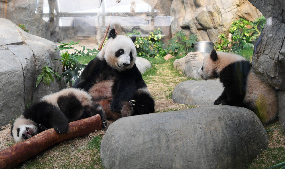 3月21日,在香港海洋公园,大熊猫“盈盈”和龙凤胎宝宝在一起。新华社记者 陈铎 摄