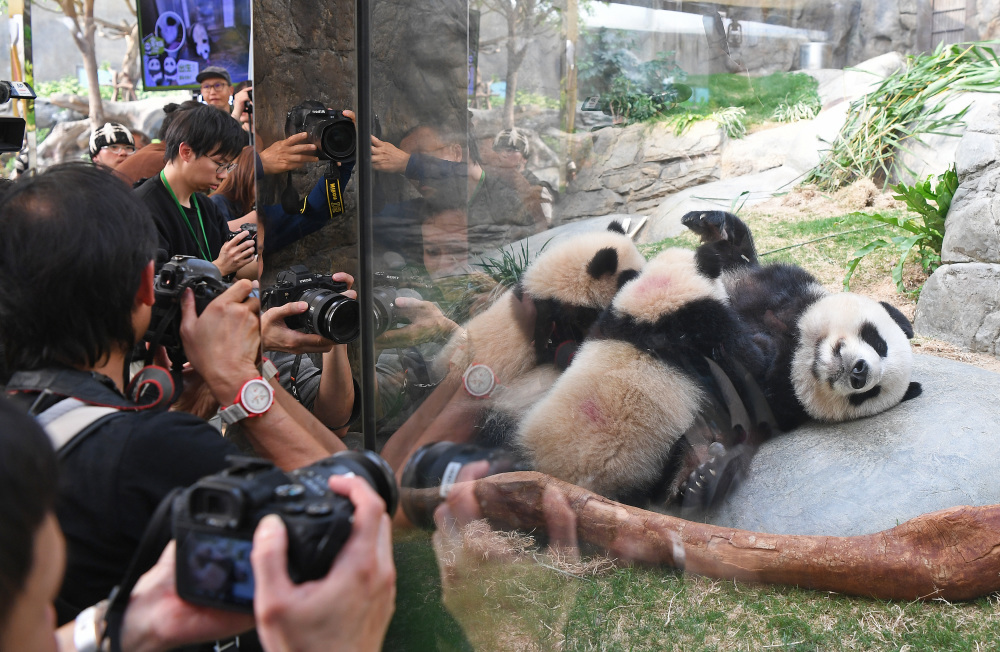 3月21日,媒体记者在香港海洋公园拍摄大熊猫“盈盈”和龙凤胎宝宝。新华社记者 陈铎 摄