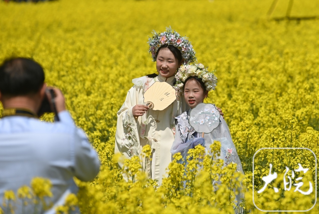 3月22日,在阜南县王家坝国家湿地公园里,两个身穿汉服的孩子在油菜花田里拍照留念。
