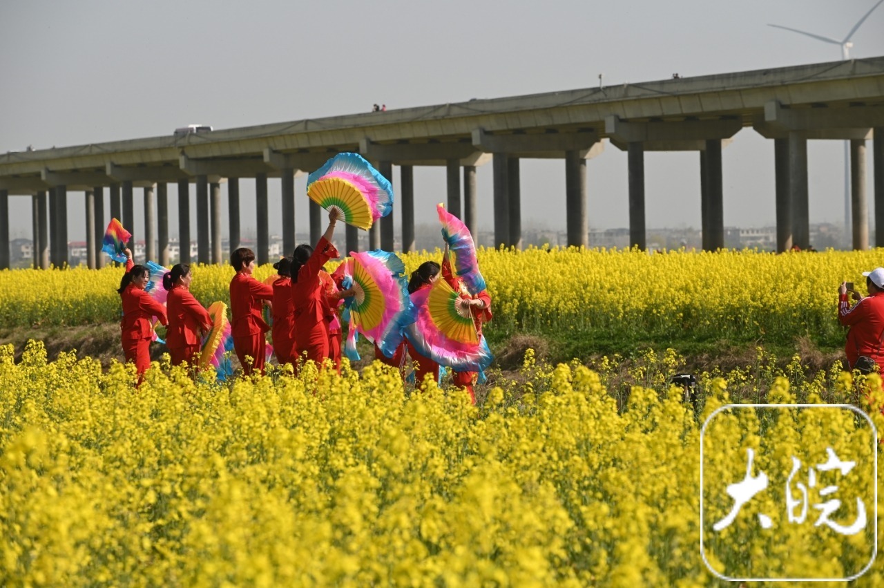 3月22日,在阜南县王家坝国家湿地公园里,中岗镇新建村的村民在油菜花田里跳舞。