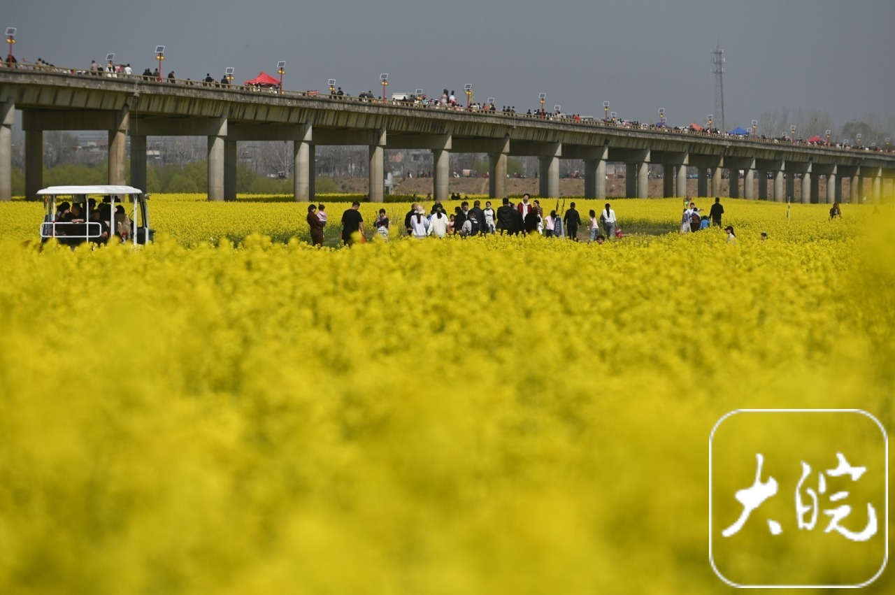 3月22日,在阜南县王家坝国家湿地公园里,蒙洼特大桥上的游客行驶在花丛中。