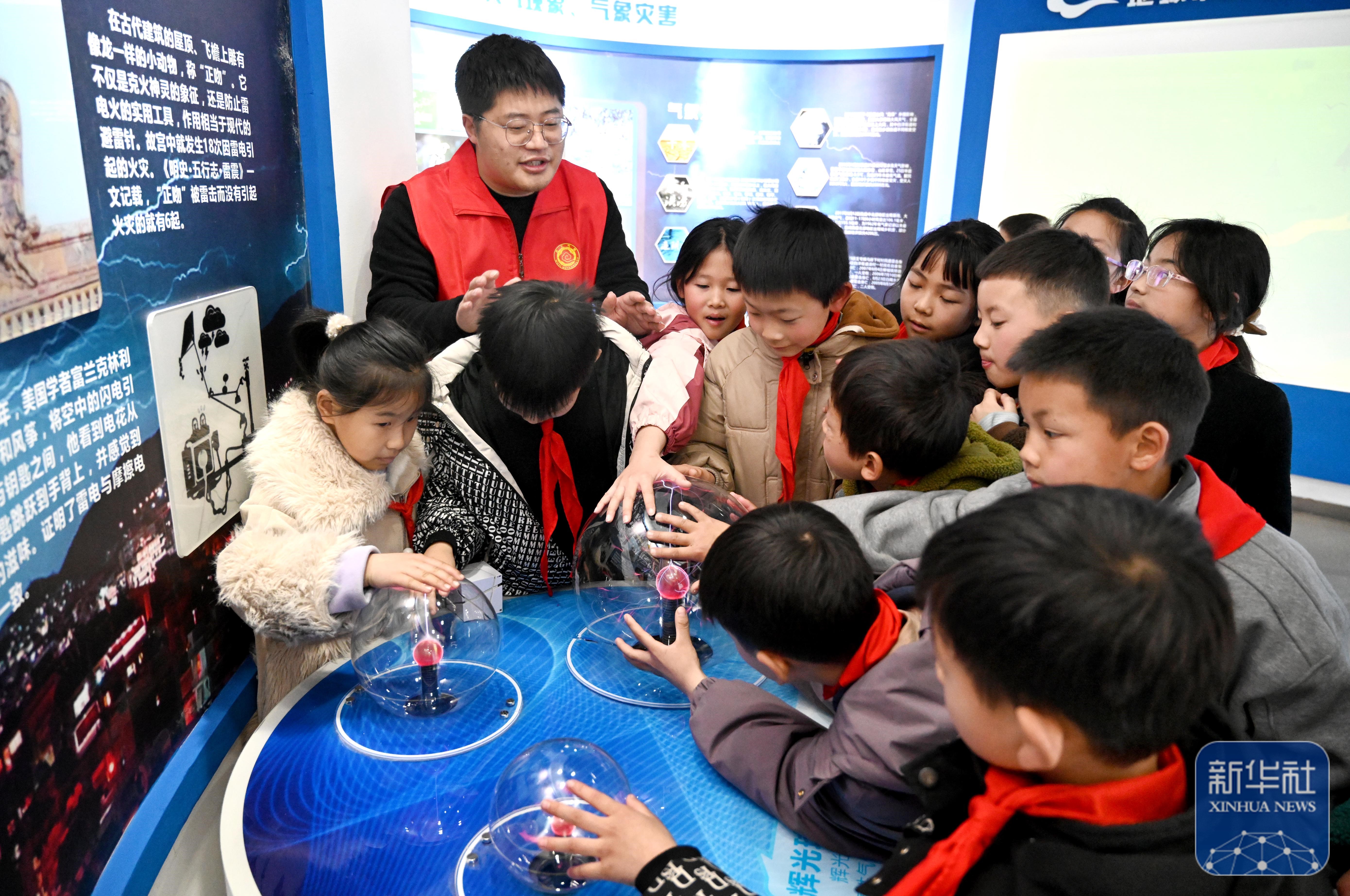 ↑3月21日,浙江省武义县新宅镇中心小学学生在县气象科普馆了解雷电产生的原因。新华社发(张建成摄)